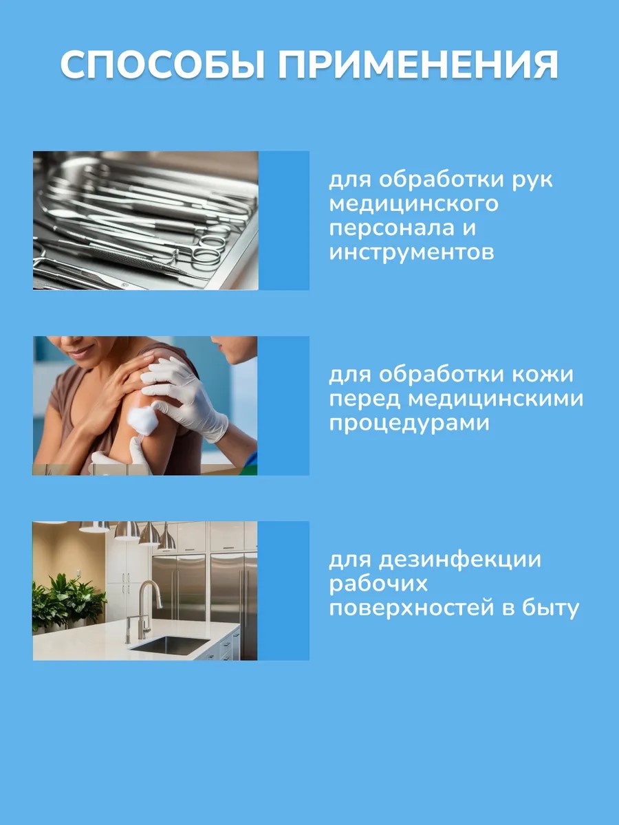 * Дезинфекция поверхностей: Раствор может быть использован для обеззараживания различных поверхностей, таких как медицинское оборудование, игрушки, дверные ручки, чтобы предотвратить распространение инфекций.